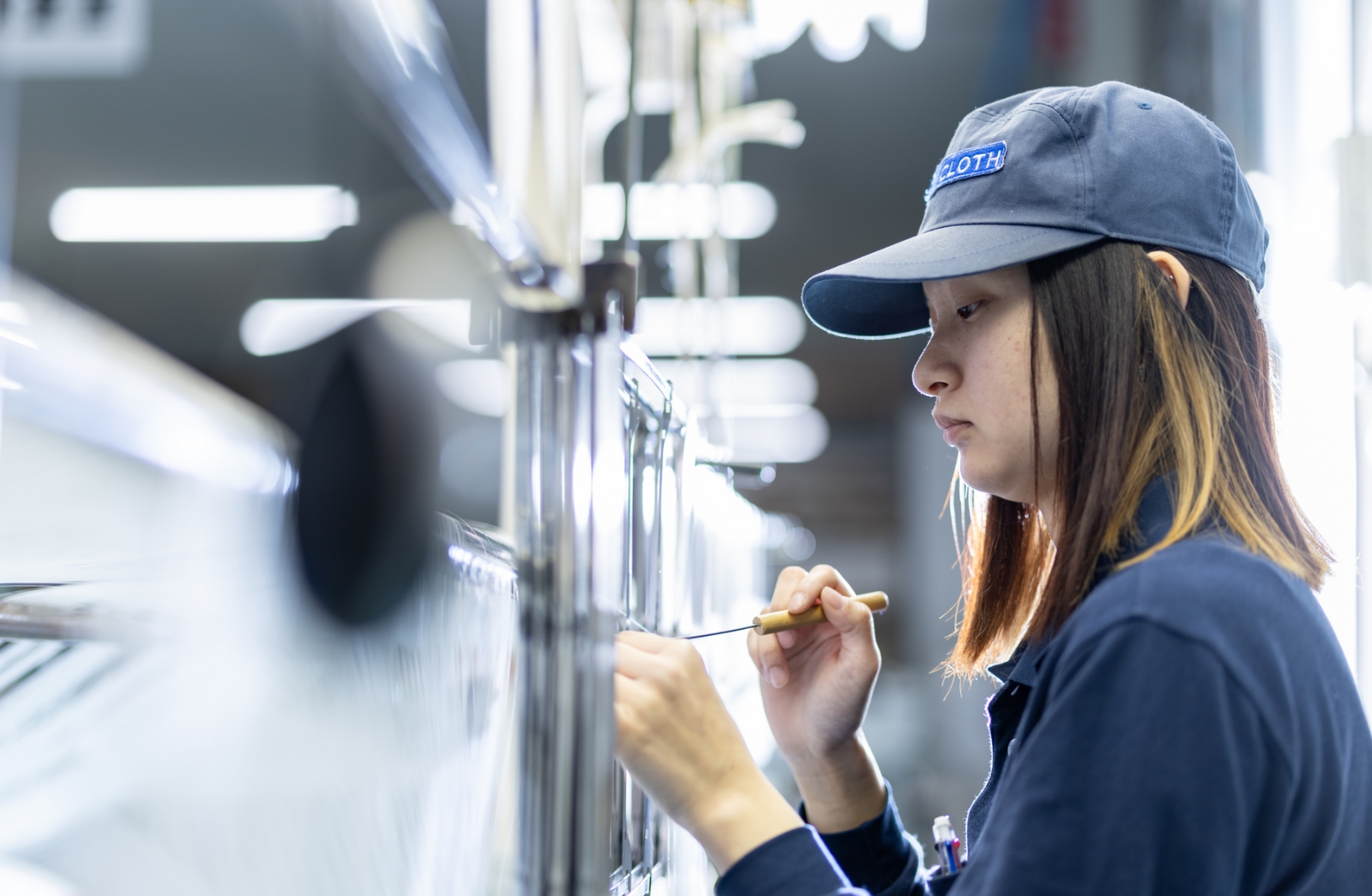 現在は基本的な作業として、たて糸の交換や、よこ糸が切れた時に、糸を直す仕事をしています。クロスを織っていると何本も糸が切れることがあって、それを元通りに直せた時はとてもうれしいです。機械の設定などの難しい仕事はまだやっていませんが、これから習得することになると思うので、早く覚えたいです。