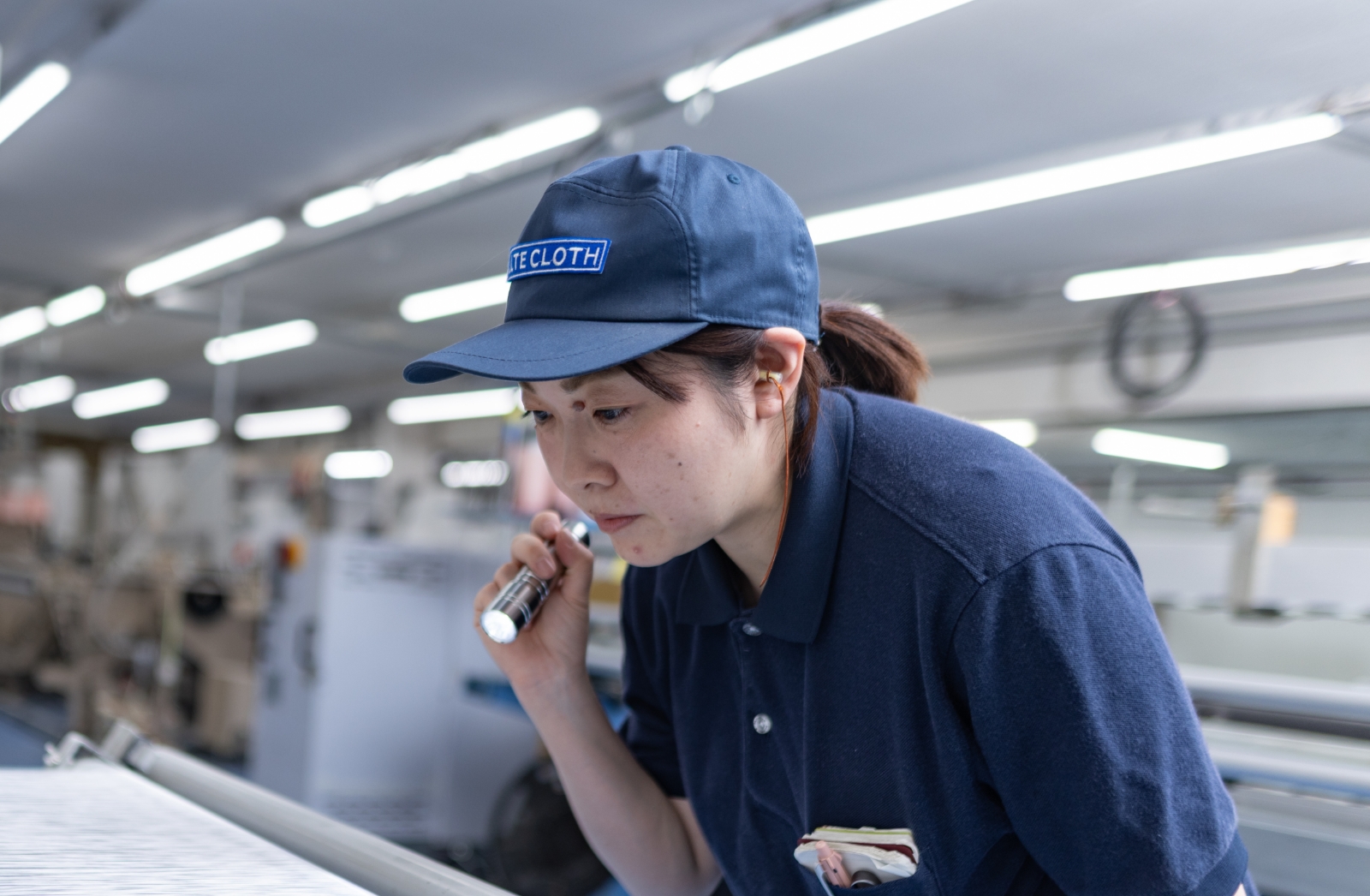 現在は、織り上がった反物を、検査台を使って検査する仕事をしています。欠点修正といって、緩んでいる糸や撚り不良の糸を修正します。糸は、1本の単糸、数本の糸を撚り合わせた撚糸があり、どうしても織りの過程で不具合が出てしまうため、拡大鏡と針を使って一つずつ直していきます。修正した後には製造課の人にも報告し、よりよい製品づくりに繋がるよう努めています。私は入社後すぐに製造課に配属となりましたが、その時の経験が本当によかったと感じています。モノづくりの現場を知っているのと知らないのとでは、検査の視点も全く違うと思うからです。